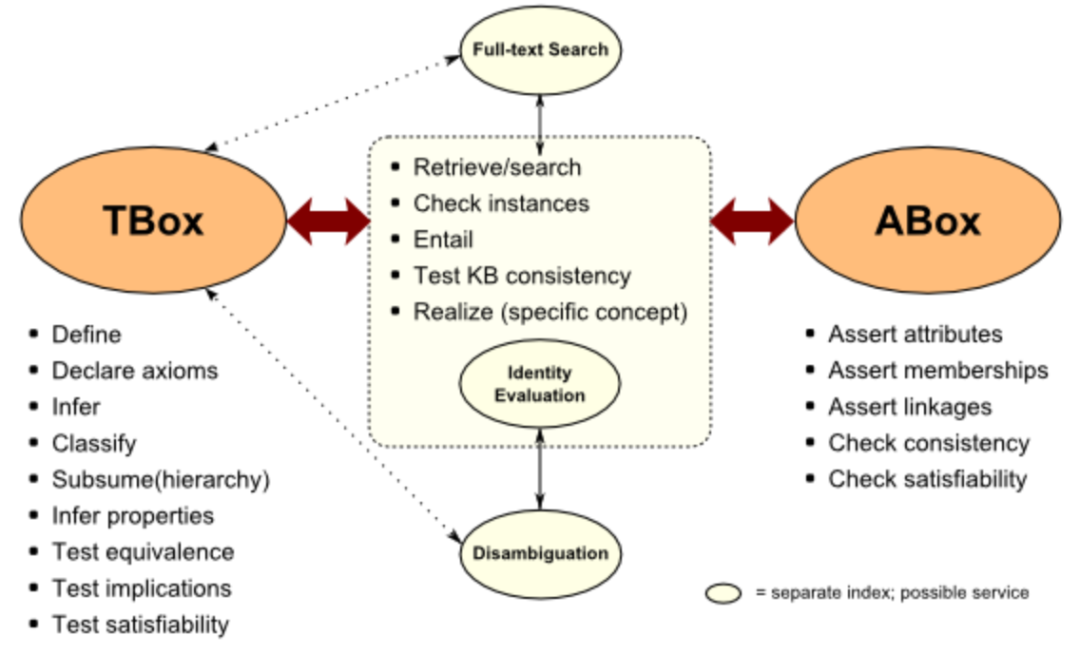 举个例子,“苹果 ∩ 绿色 = 酸涩”这属于概念断言,放在Tbox中;“我手里现在有10只苹果,其中3只是绿色的“,这属于实体断言,放在Abox中。基于Tbox和Abox,我们可以推理出我手中的苹果里有3只是酸涩的,7只是甘甜的,这属于推理系统。