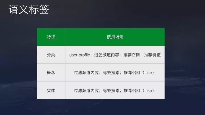 上图是头条语义标签的特征和使用场景。他们之间层级不同,要求不同。