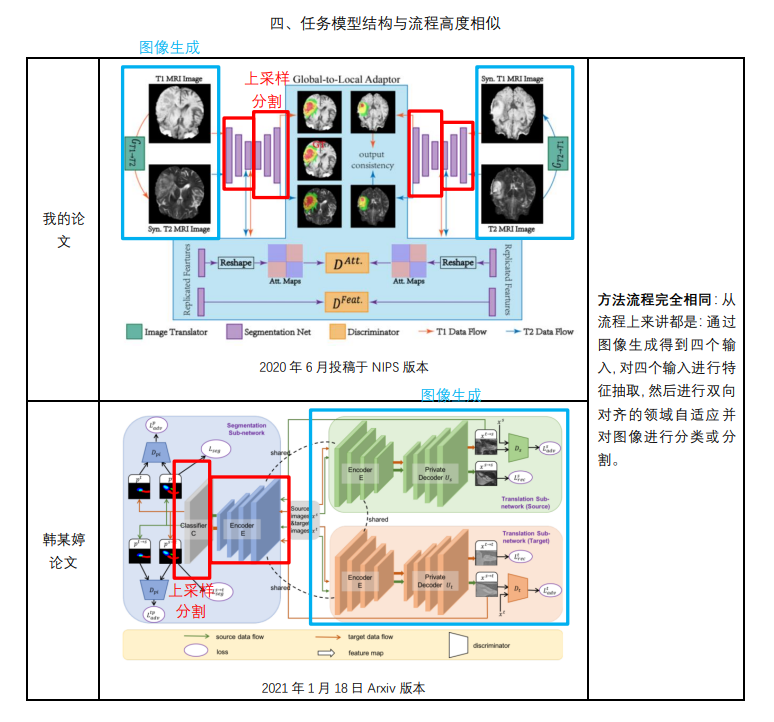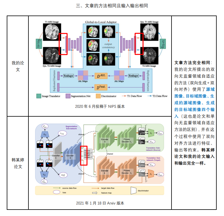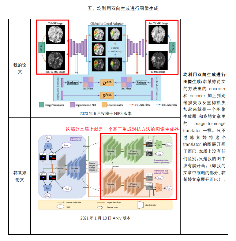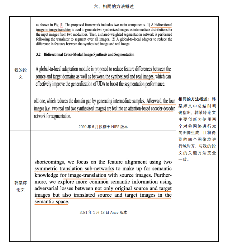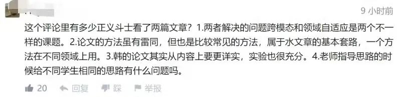 还有网友对比了两篇文章,认为两者所用方法应用的课题不一样,一个是应用于跨模态方面,一个是应用于自适应方面;方法虽然雷同,但也不能说是剽窃,因为是为不同领域服务的;韩某某的论文内容和实验都更详细。