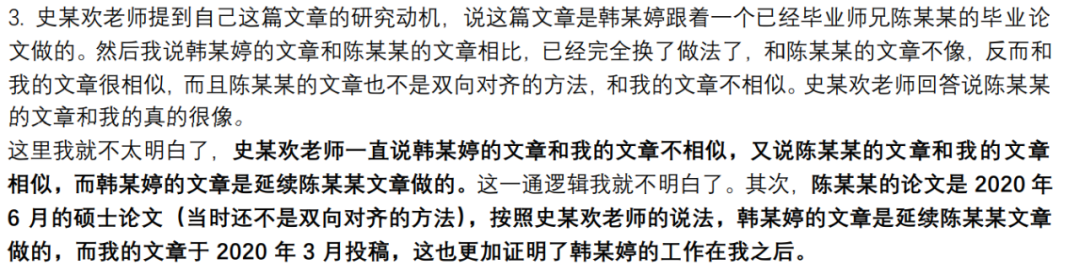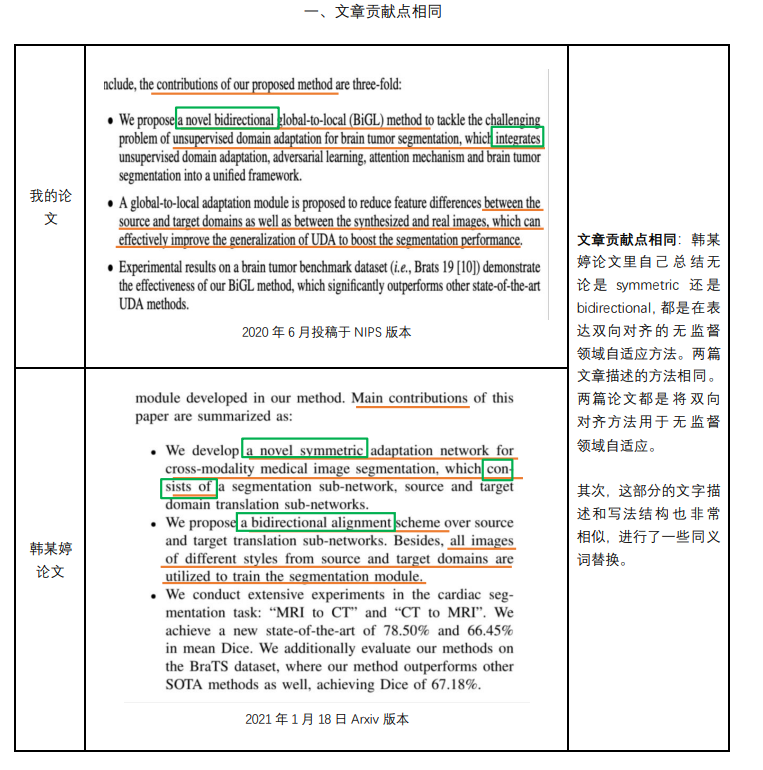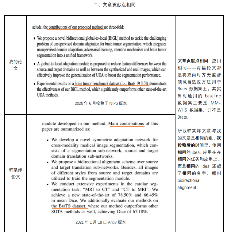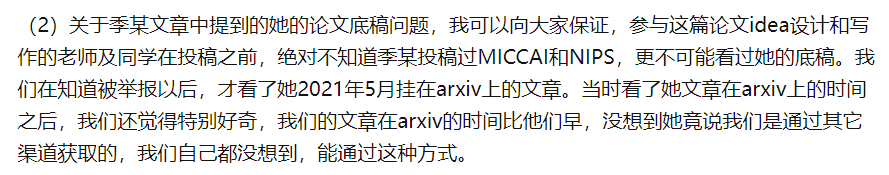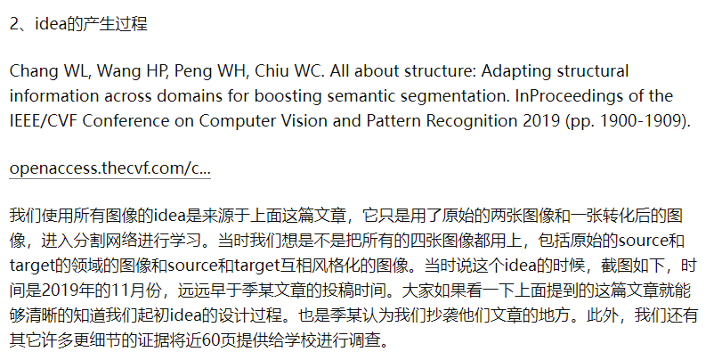 2021 年 1 月 21 日,季某在阅读论文时发现,同组(同一个大组,不同的导师)同学韩某某公开在 arxiv 上的论文与自己的文章 idea 和实验高度相似,她表示,韩某某论文「所提方法和主要贡献点完全源于我的文章、方法流程高度相似、部分文字相似、相同的应用等。」据此,她认为,韩某某存在剽窃行为。