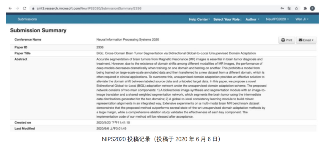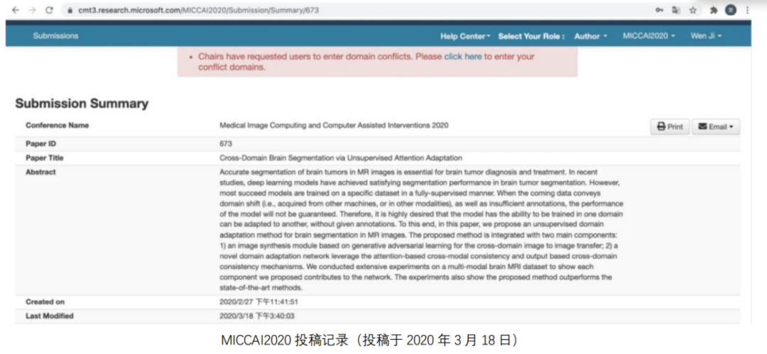 2020 年 3 月 18 日,她在 cmt 投稿系统中投稿提交了 MICCAI 2020 论文《Cross-Domain Brain Segmentation via Unsupervised Attention Adaptation》。由于得到的反馈并不好,她又在 2020 年 6 月 6 日在 cmt 投稿系统中将该论文重投于 NIPS 2020。但遗憾的是,两次投稿都没有中。
