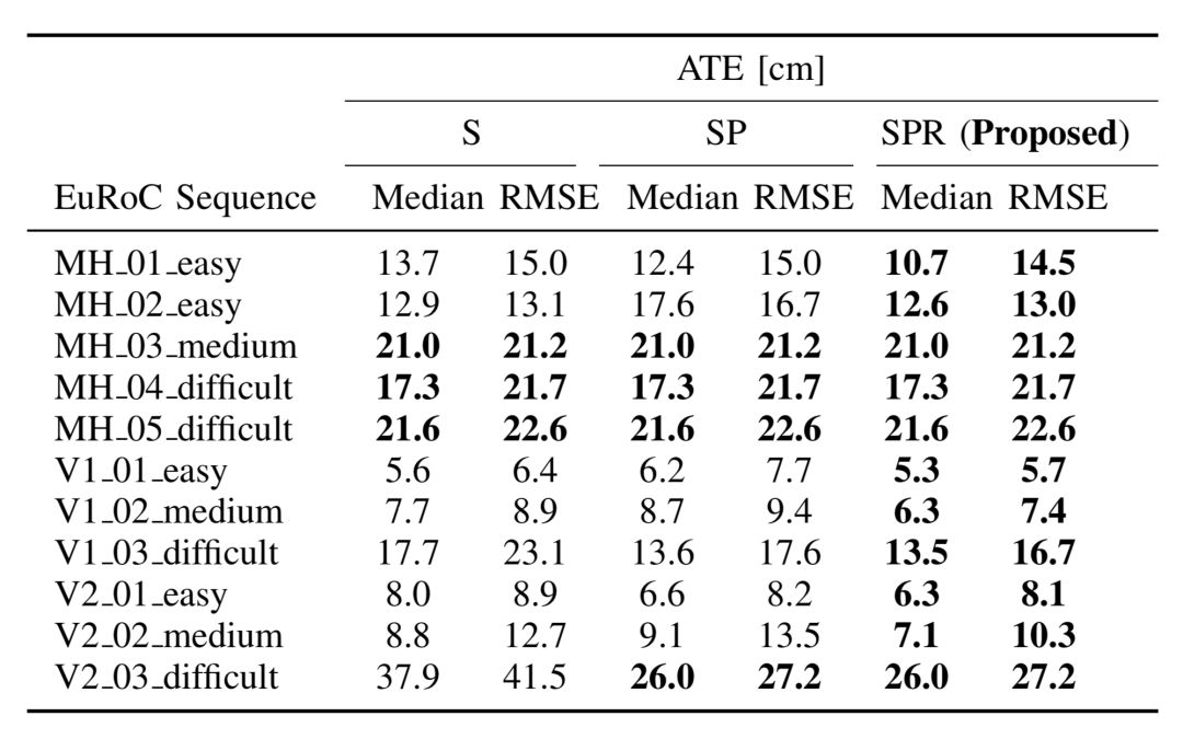 表1 S,SP和SPR的绝对平移误差。所提出的SPR方法表现最为优秀。