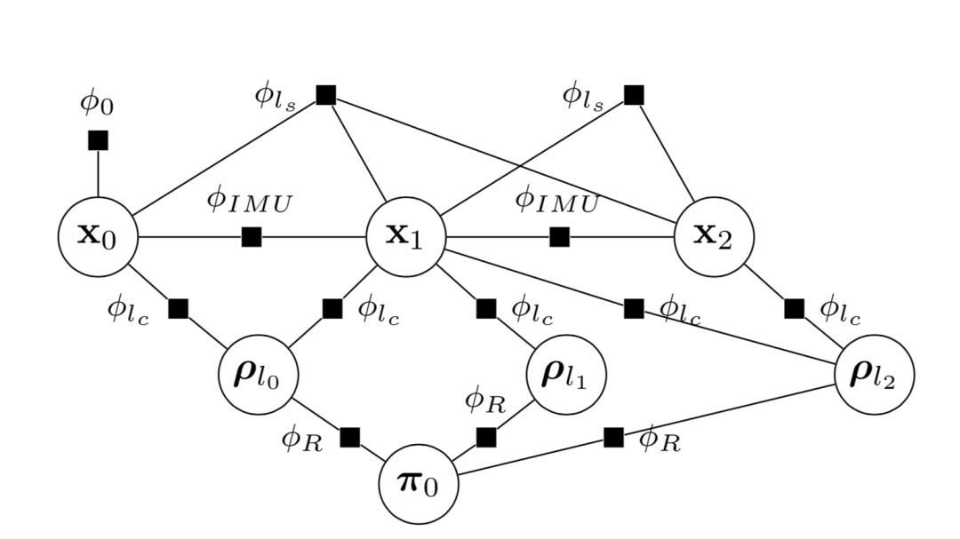 图2 结合无结构(φ_{l_s}),投影(φ_{l_c})和规则化(φ_R)因子的VIO因子图。 因子φ_R表示路标点l_i和平面π_0之间的相对约束。