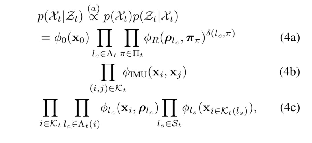 (4a)对应于已知的关于X_t的先验信息。因子φ_0代表一个之前在第一状态的优化的时间范围。(4a)包含了约束路标点lc和平面之间的规律性因素φ_Rπ。还包含了数据关联术语δ(l_c,π),当路标点l_c被关联到平面π的时候返回1,否则0。