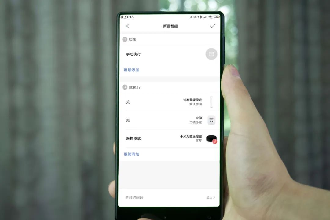 这个场景需要设置两个地方,首先是米家app中设置一个手动执行的联动,手动执行则关闭窗帘,打开氛围灯与电视开关,万能遥控器的配置也很简单,查看说明即可操作,设置完成后就来到下一步分。