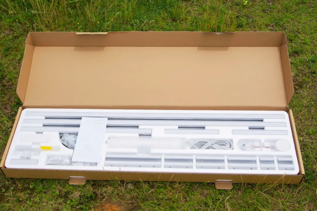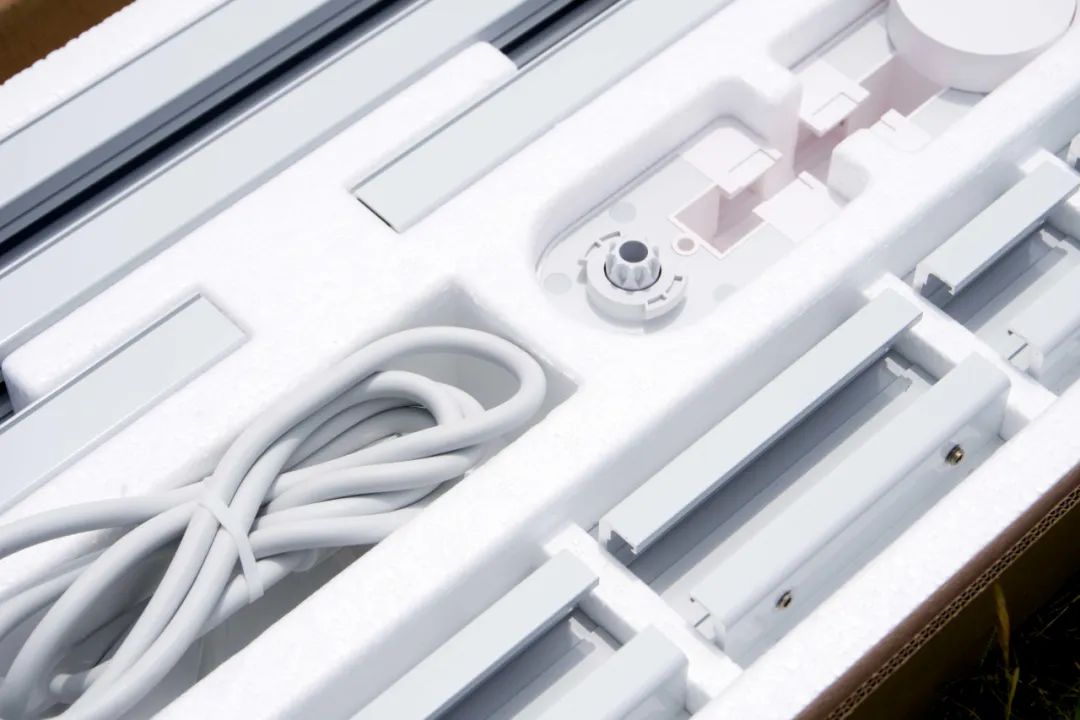 打开后首先是看到的就是长短不一的轨道和配件,整整齐齐放在盒子里,这也是我见过所有窗帘包装里最精致合理的一款,一般购买窗帘轨道和电机都是分开发货的。