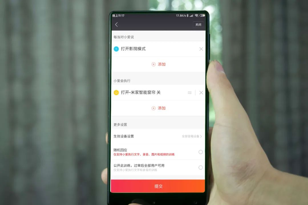 第二步打开小爱音箱app,添加一个小爱训练,对小爱同学说打开影院模式,则执行刚才设置好的联动,设置完成后对小爱同学说就可以实现动图上的效果,还可以根据自己的喜好进行修改。