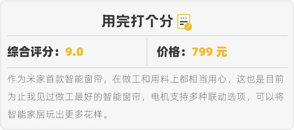 再来总结一下,这款窗帘相比我之前的绿米那款多了很多联动选项,再执行窗帘操作是可以联动其它设备,这个还是非常不错的,售价也不贵,那么就来期待一下视频体验吧!