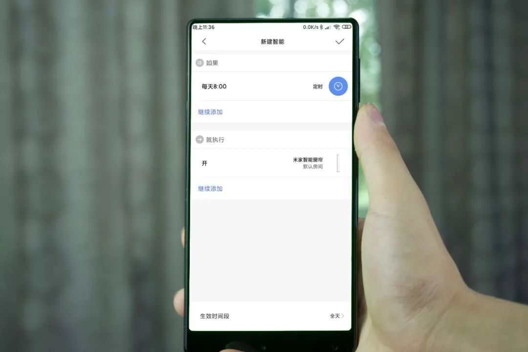 再来看一个和今天主题有关的,叫醒你的,可以是阳光。这个联动的设置方法很简单,只需要设置一个定时,比如说我设置为 8:00 钟的定时,时间到了以后就会自动打开窗帘,此时睡意朦胧的你通过微光的刺激就会逐渐醒来,下面来看下设置页。