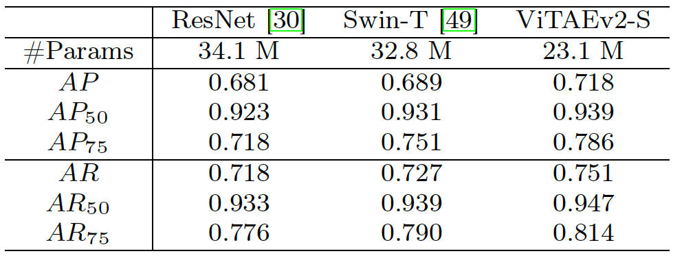 我们首先在ImageNet-1K数据集上评估了所提出的ViTAEv2模型的分类任务表现能力。结果如表4所示。所提出的ViTAEv2模型在各个模型尺寸下均取得了SOTA的分类任务表现,并以更少的参数量取得了超越非多阶段堆叠方式的ViTAE模型。这验证了所引入的归纳偏置在多阶段的堆叠方式下的有效性。
