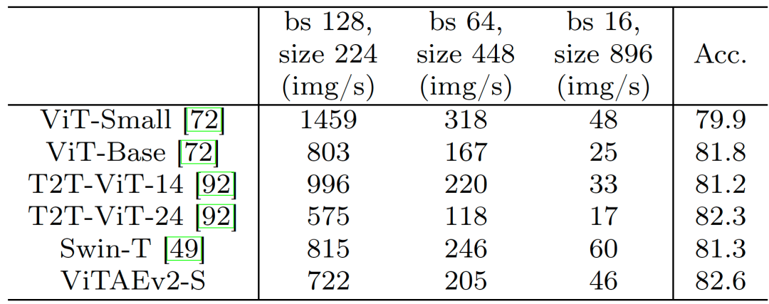 我们进一步评估了所提出的ViTAEv2模型的推理速度和模型表现。我们选取了模型规模相似的模型,并对所有模型使用TensorRT进行加速。结果如表8所示。我们可以发现,和Swin Transformer相比,ViTAEv2慢了10%左右的速度但是有1.3%分类准确度的显著提升。相较于T2T-ViT-24模型,ViTAEv2模型在推理速度和分类准确度上均有优势。
