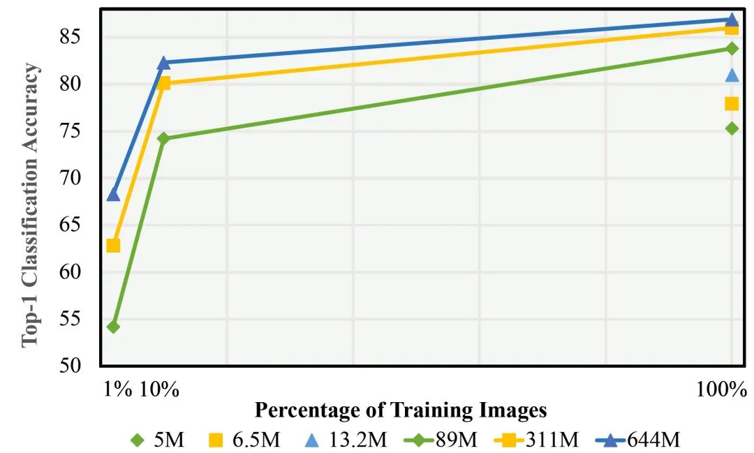 此外,我们还探索了大规模ViTAE模型的少样本学习能力。我们分别使用1%,10%,和100%的数据对大规模ViTAE模型进行了微调。结果如图2所示,仅仅使用10%的数据进行训练,ViTAE-H模型的分类准确度达到了82.4%,超过了小规模模型ViTAE-13M使用100%数据进行全监督训练的准确度(81.0%)。这说明了大规模模型具有很强的少样本学习能力。