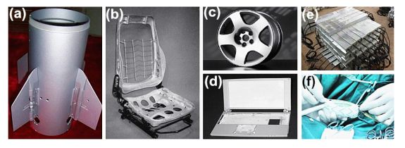 图2.1镁合金的应用示例 (a) 轻型导弹壳;(b) 座椅框架;(c) 汽车轮毂;(d) 笔记本外壳;(e) 牺牲阳极材料;(f) 医用镁合金缝合线