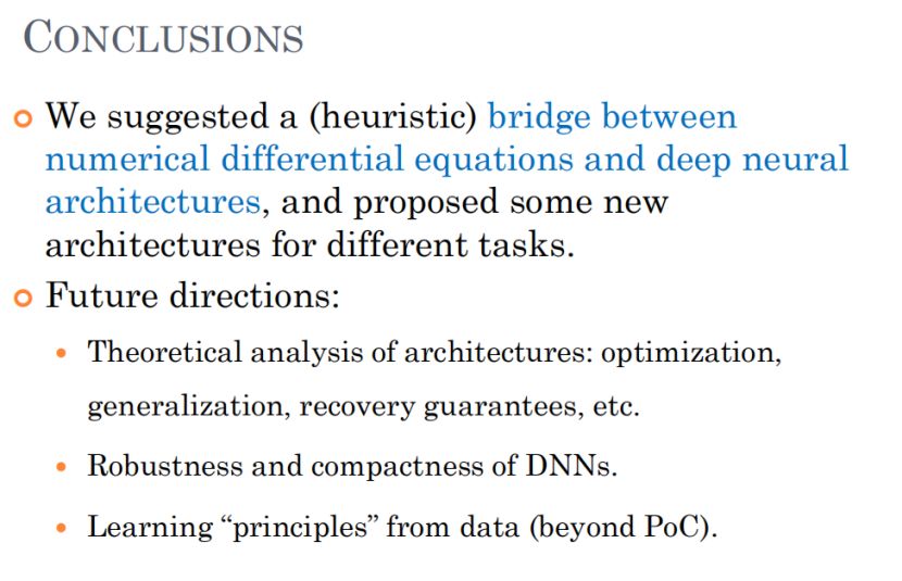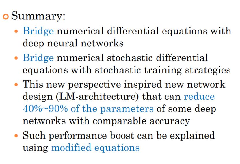 总而言之,董彬的目标是建立起数值 ODE 和网络构架设计之间的关系,并借此从计算数学反推网络构架。利用数学的直观,设计网络构架时就知道应该对深度是有压缩,知道其可能带来的性能提升,也可以解释为什么有这样的提升。