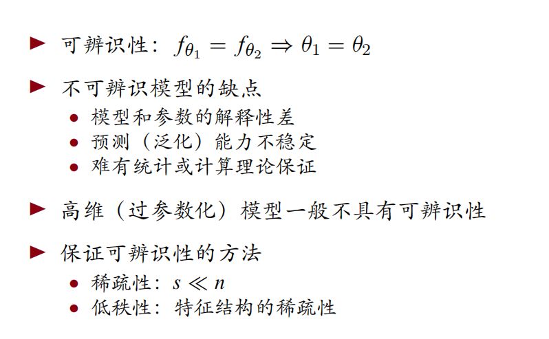 为了保证可辨识性,可以采取稀疏和低秩两种方法,事实上后者也属于稀疏性。这在高维统计已经做得非常成熟了,很多情况下我们提的条件中都隐含了可辨识性。但如果不能满足精确可辨识,是不是就无计可施了?我们去看一下文献,因果推断理论有很多情况实际上是不可辨识的,因为因果推断实际上极其难,无法给出点估计,但可以定界。因而便引出了近似可辨识性这样一种新的理论框架。