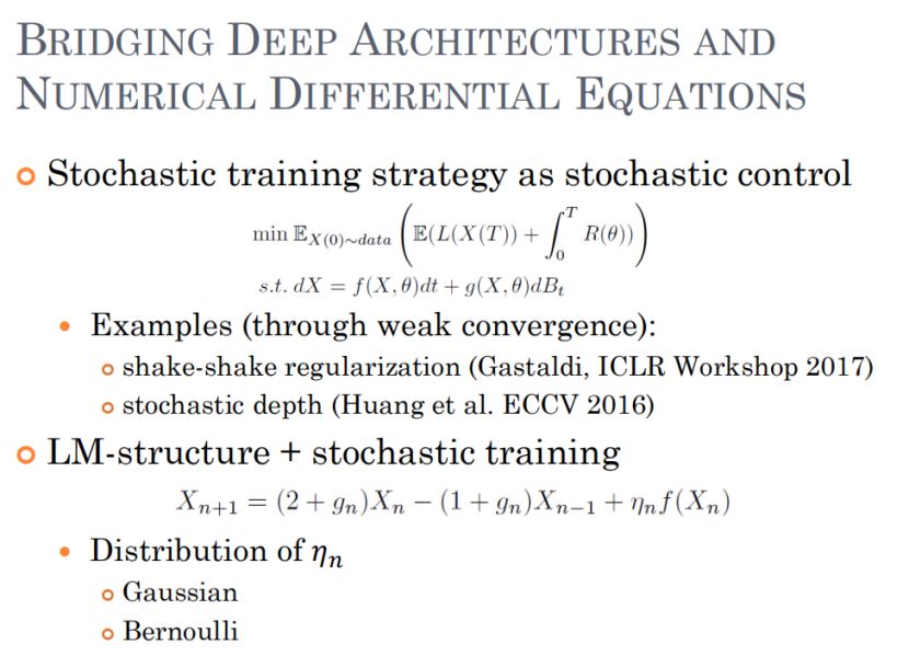 除此之外,深度学习训练时还会遇到各种随机扰动,这可提升训练效果。如果在训练时加上一些随机扰动,比如随机加一些噪声,那么其对应的动力系统是什么,自然而然地会想到随机偏微分方程。到底是不是呢?有两个例子,一个是 shake-shake,一个是 stochastic depth,都是对于残差网络设计的随机扰动训练。