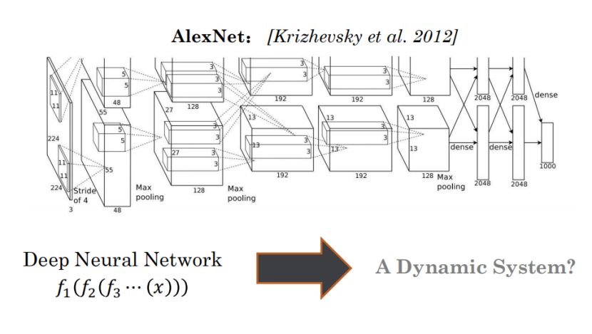 我们先来看 DNN(深度神经网络,主要是卷积网络)和数值 ODE 之间的关系。以 AlexNet 为例,若要用数学形式写出,可以将其看作一个动力系统,但是这样的动力系统很难分析,因为缺少特殊结构,这样一般形式的动力系统不知该如何入手。