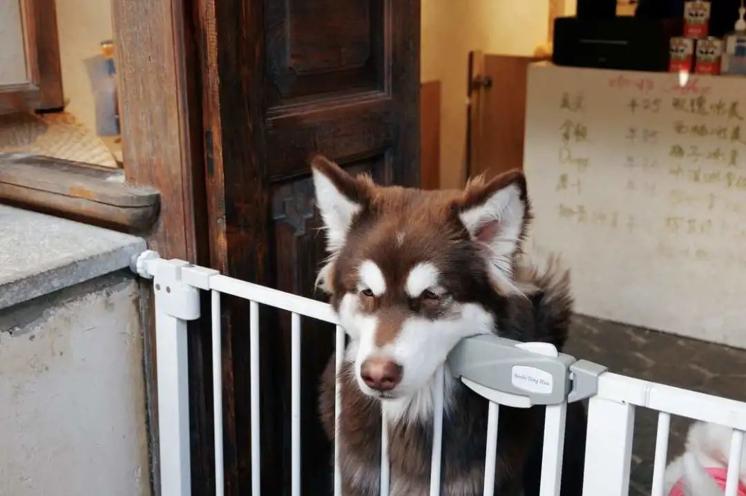 照片故事:喜洲古镇一家咖啡馆的乖乖阿拉斯加。(在另一家咖啡馆门口还遇到了一只同色系的北京阿拉斯加,酷酷站在机车前面和主人一起旅行。
