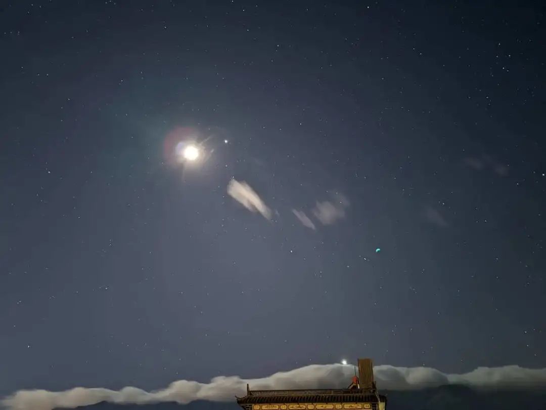 照片故事:三星一线,三星粉狂喜。照片中最亮的是月亮,月亮右边是木星,屋檐上方是金星,木星与金星之间最亮点是土星。(土星右边的月牙形状是鬼影,无中生月。)
