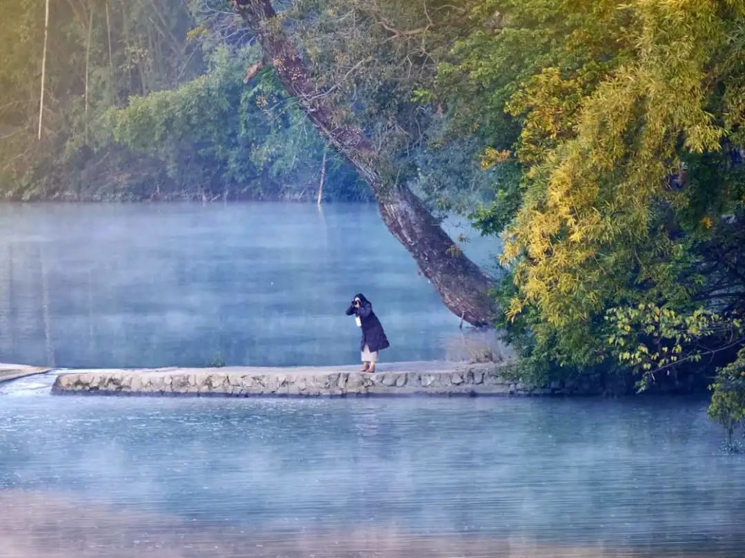 照片故事:对面的导游小姐姐在拍照。我也不知道为啥日出过后,阳朔的河面满是雾,岸边会有这么梦幻的场景。