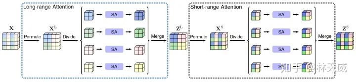 论文基本思路:这篇论文的基本思路是“交错”。如下图所示,首先通过permute将feature以一定规律打乱,然后将feature map分为几个块分别做self-attention,这样获得的是long-range 的attention信息;此后,再进行一次permute还原回原来的特征位置,再次进行分块attention,获得了short-range 的attention。通过拆解long/short range的attention,能够大大降低计算量。