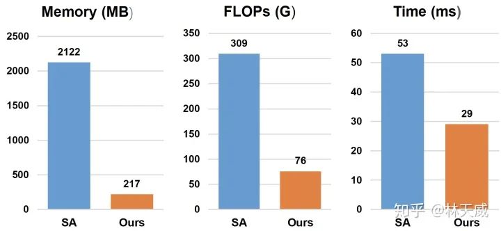 具体的性能表现如下图所示,可以看出,下降最明显的是显存的占用,主要是因为避免了attention过程中的大矩阵。而由于permute,divide等操作虽然不占flop,但是在inference的时候需要一定的时间,所以实际速度没有flops提升的那么多。不过总体而言,在效果没有明显下降的前提下,这个速度/显存的优化已经很优秀了。