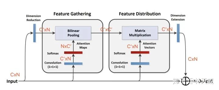 第一个 feautre gathering,可以理解为对每个channel,softmax找到最重要的位置,再去gathering所有channel上这个最重要位置上的特征;得到 CxC