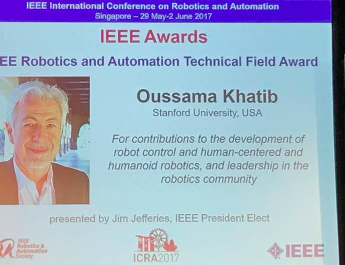 这一奖项是为了表彰 Khatib 教授在机器人控制、以人为核心的人形机器人的发展所作出的重要贡献,此外也肯定了他在机器人学术界所起的领袖作用。