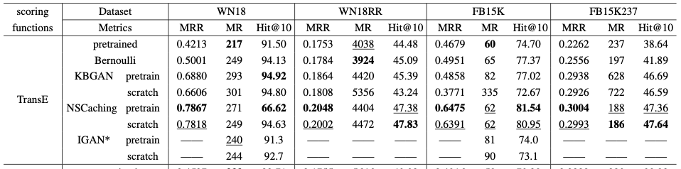 作者在多个标准数据集上进行了实验,如下图是在利用TransE,在不同标准数据集上,和其他负采样方法对比的结果(更多利用其余KGE的实验结果请参考原文),可以看出这里提出的NSCacheing优于其他的负采样方法。