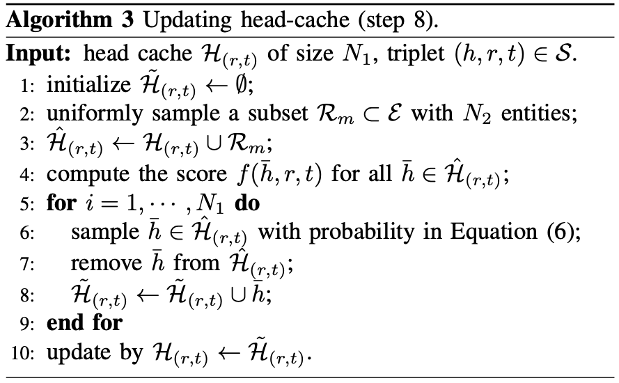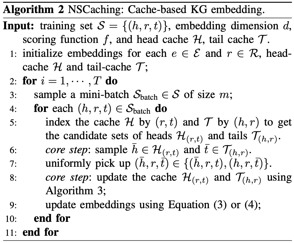 模型设计了一个缓存机制,保存了知识图谱中每个三元组对应的分数较高的负样本三元组,Algorithm2中展示了基于该缓存机制的知识图谱表示学习模型的学习过程。