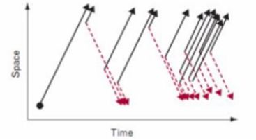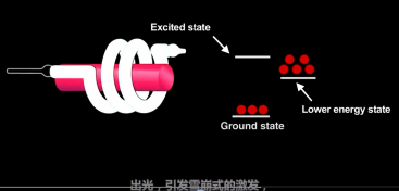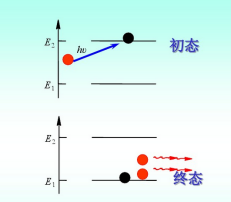 所谓激光,就是激发态的原子(黑色),受到某一外来光子(红色)的作用,而且外来光子的能量恰好满足 hv=E2-E1,原子就有可能从激发态 E2 跃迁至低能态 E1,同时放出一个与外来光子具有完全相同状态的光子(另外一个红色粒子)。这一过程被称为受激辐射。 这就是激光产生的第一条件:受激辐射占主导地位。