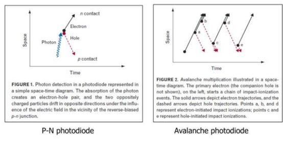 如下图所示,雪崩二极管工作在线性区。当光子入射时,电子-空穴对分离(光电子效应)。一般的二极管,分离出的电子无法分裂其他电子空穴对。但是雪崩二极管的电子空穴对可以被分离出的电子、空穴继续激发其他电子空穴对,电子、空穴成倍增加,电流不断增大。
