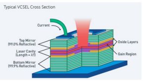 VCSEL 称为垂直腔表面发射激光器。VCSEL 从垂直衬底的面发射激光,因此很容易通过平面工艺实现大规模发光阵列;发射激光的束散角较小,光斑近似于圆形;对于光学系统的要求低;工艺与 LED 兼容,有利于大规模制造,降低成本。