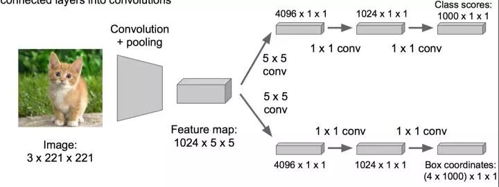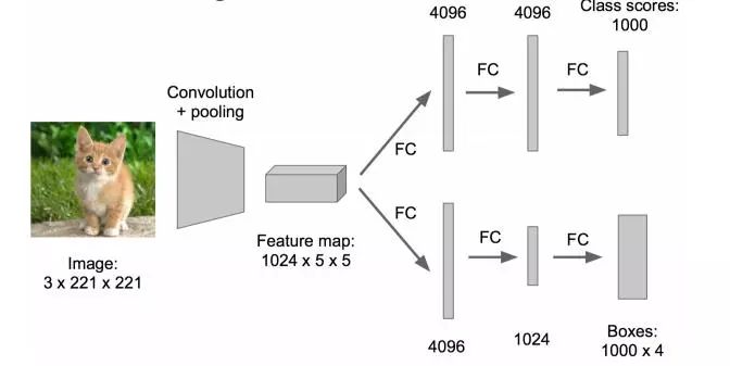 • 在上述神经网络的尾部展开(也就说CNN前面保持不变,我们对CNN的结尾处作出改进:加了两个头:“分类头”和“回归头”)