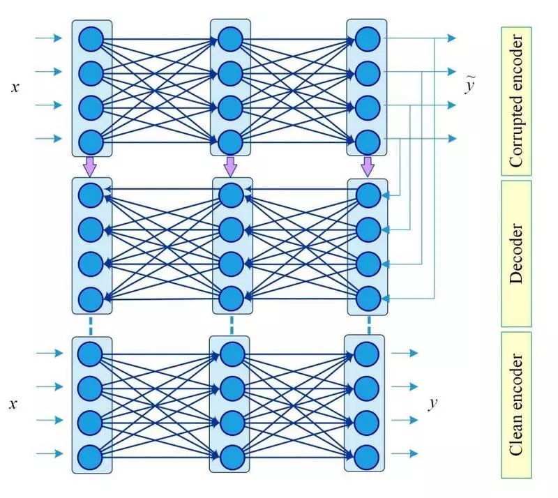 阶梯网络在无监督和半监督学习任务中达到了先进的水平。阶梯网络由两个编码器和一个解码器组成。编码器作为网络的有监督部分,解码器进行无监督学习。训练目标是最小化有监督部分和无监督网络的损失和。