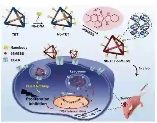 负载铂药的自组装DNA四面体结构,在纳米抗体引导下被肿瘤细胞摄取并在胞内释放铂药,实现肿瘤生长抑制