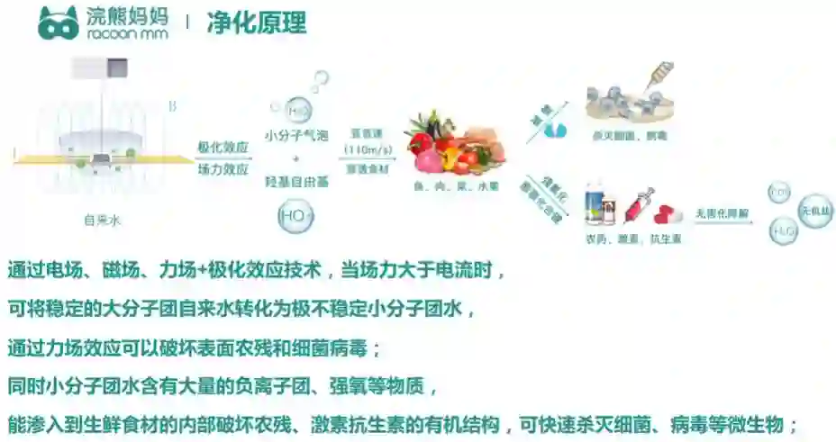 “浣熊妈妈”通过极化技术将稳定状态的大分子团水,转变为极不稳定的小分子团水,小分子团水中含有大量的负离子团、强氧等强氧化性物质,可以将食材表面及内部残留的有机农药、激素、抗生素以及致病微生物进行降解及灭活,经多家检测机构检测,降解率可达97%以上。