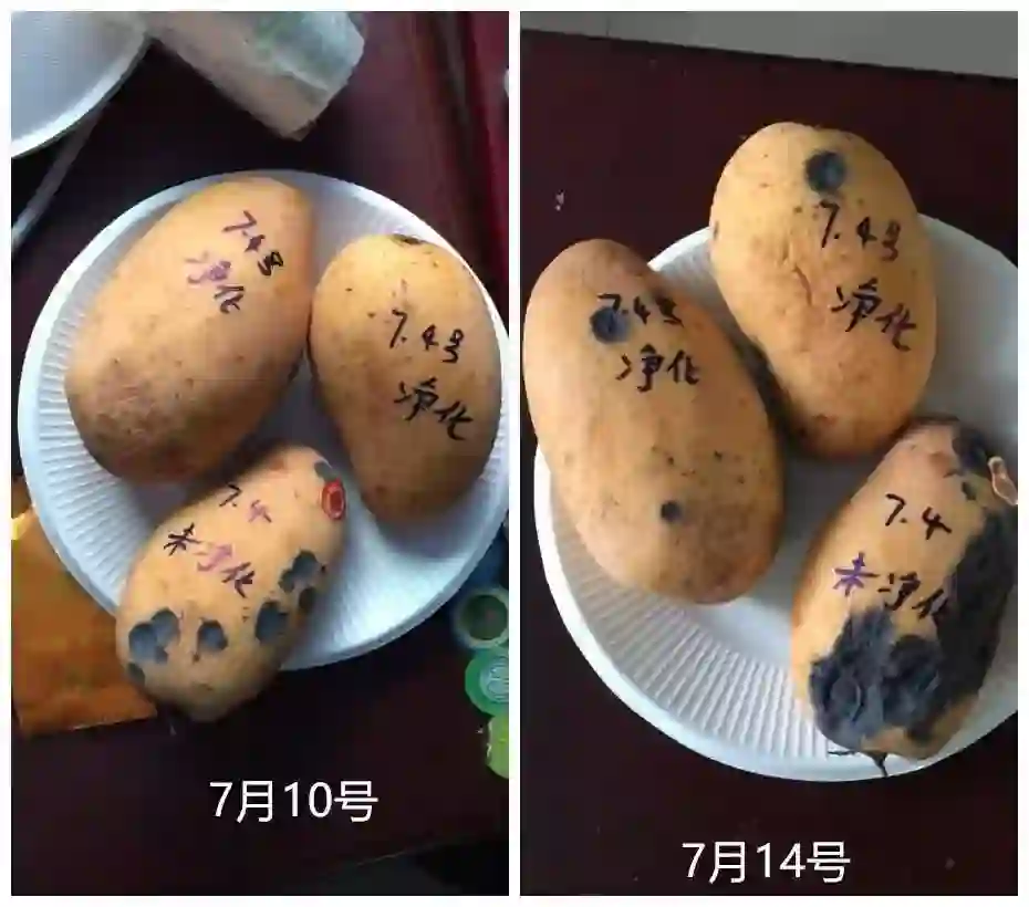 “浣熊妈妈”于7月4日将同一批芒果用来测试,6天和10天的对比图。