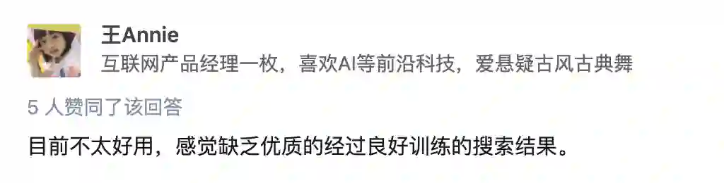 此外也有用户在相关知乎话题下回答称不太好用,「感觉缺乏优质的经过良好训练的搜索结果。」