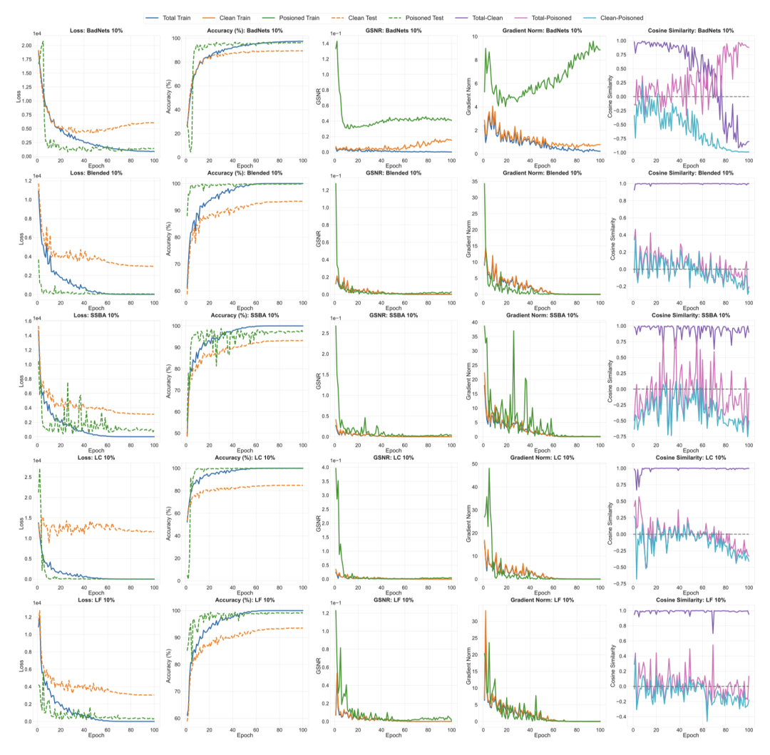 其次,在训练的早期阶段,中毒样本上的梯度模长比干净样本上的梯度模长大得多 (如第四列所示)。与之对应,总训练样本梯度和中毒训练样本梯度的余弦相似度明显大于干净训练样本梯度和中毒训练样本的梯度的余弦相似度,尽管中毒样本的数量远远小于干净样本的数量。