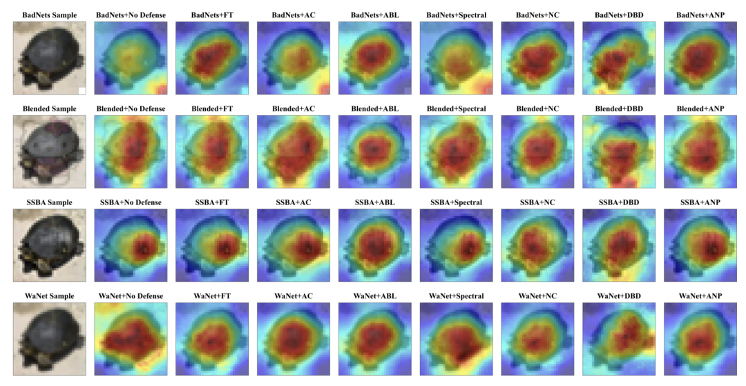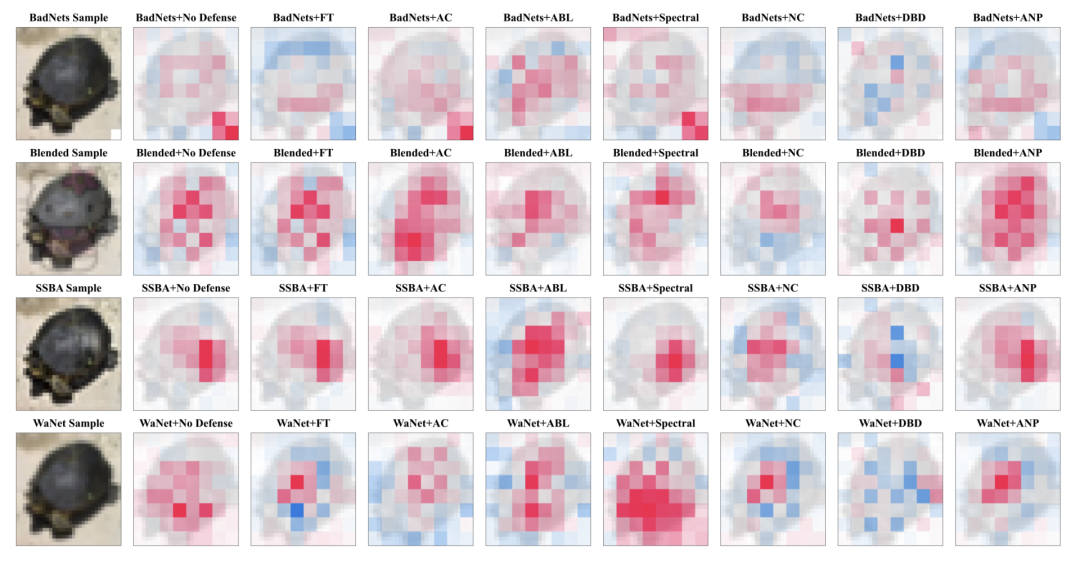 到目前为止,我们已经实现了9种SOTA的后门攻击和12种防御方法,并提供了5种分析工具(t-SNE、Shapley value、Grad-CAM、Frequency saliency map、Neuron activation)(更多方法和工具将不断更新)。
