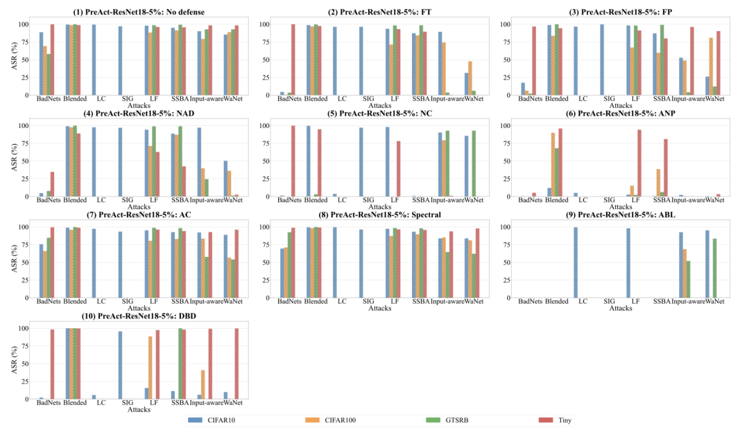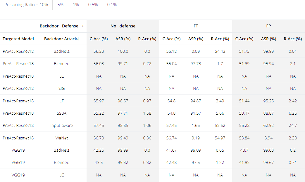 研究人员在4个数据集(CIFAR-10、CIFAR-100、GTSRB、Tiny ImageNet),5个模型结构(PreAct-ResNet18, VGG19, EfficientNet-B3, MobileNetV3-Large, DenseNet-161),8个攻击,9个防御,5个投毒浓度(0.1%、0.5%、1%、5%、10%)下进行了实验(正常的训练流程,考虑到普适性没有使用复杂的预处理)。