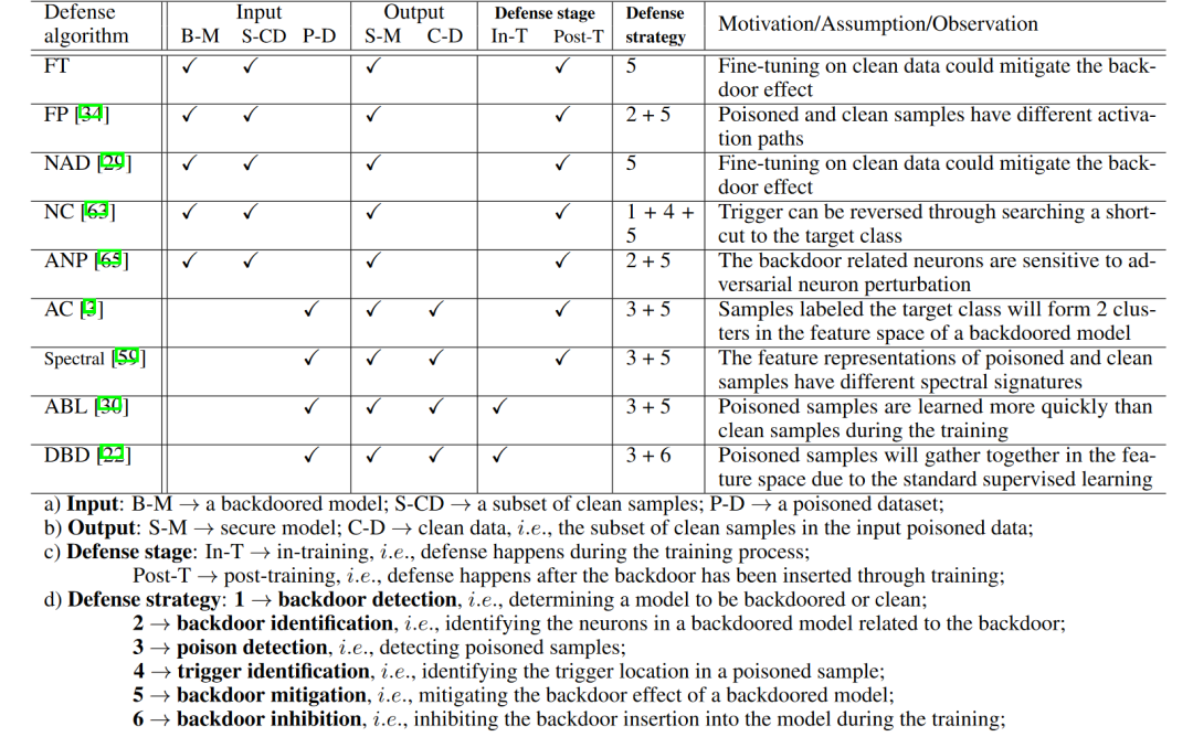 BackdoorBench目前已经集成了主流的9种攻击和12种防御算法,目前已经进行完整测试的攻击和防御方法如下图所示: