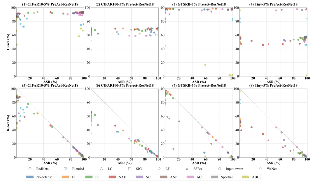 第一排的图用C-Acc vs ASR作为坐标,攻击者和防御者都希望点落在较高的区域,但是攻击者希望能尽量落在右上角而防御者则是希望落在左上角。实际情况是大部分的点都是在同一水平线上,说明部分防御方法都能在不太影响模型自身准确率的情况下抑制后门模型的影响。