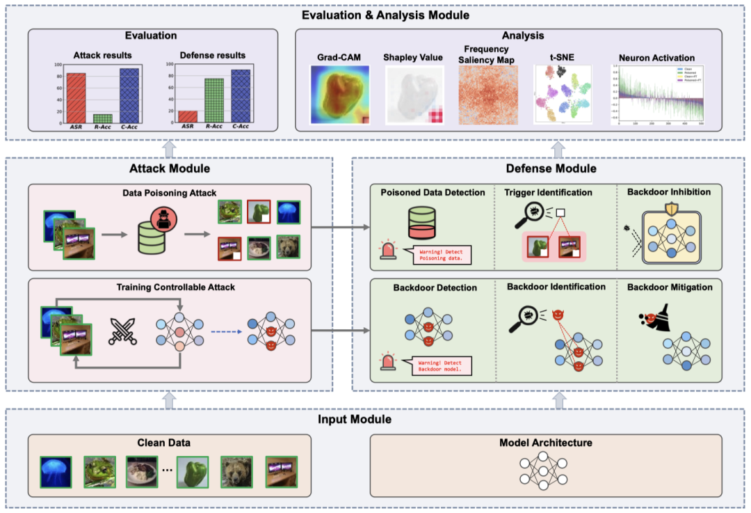 为了缓解这种困境,我们建立了一个全面的后门学习基准,称为BackdoorBench。它由输入模块、攻击模块、防御模块以及评估和分析模块组成。