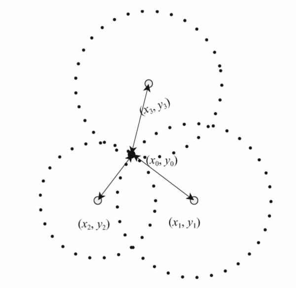 上图中的(x1,y1)、(x2,y2)、(x3,y3)是3个无线基站的地理坐标,同一部手机到达这3个基站的时间乘以光速就是手机距离基站的距离,分别以基站坐标为圆心以距离为半径画圆,3个圆相交的地方就是手机的位置(x0,y0)。