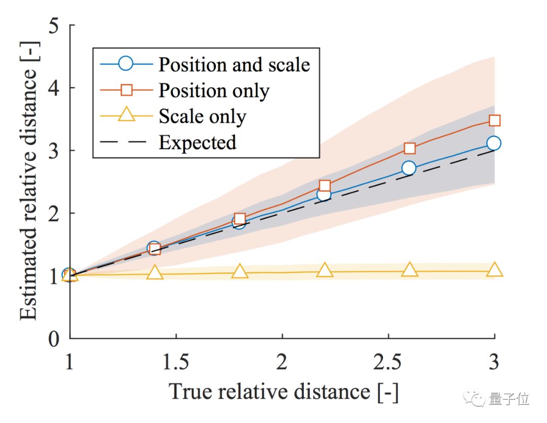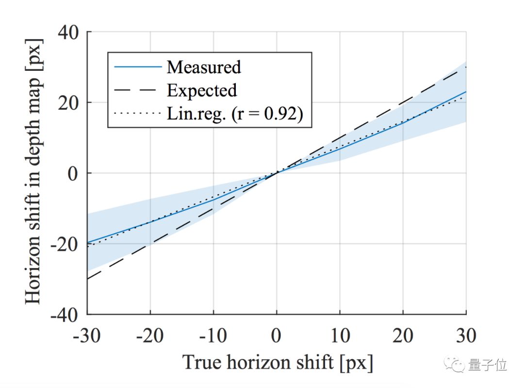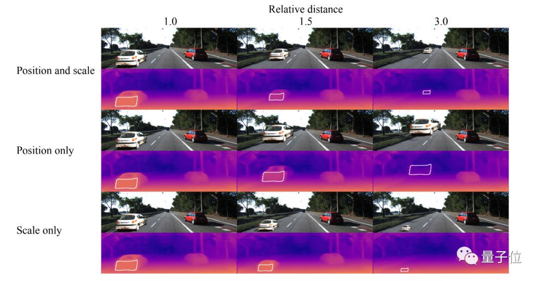 但是在第三行中,保持物体的纵坐标不变,只是缩放大小,整个神经网络的输出其实相当一致,并没有剧烈变化。(都注意预测中白框内的结果即可,也就是车尾的距离)下面是一个定量的结果: