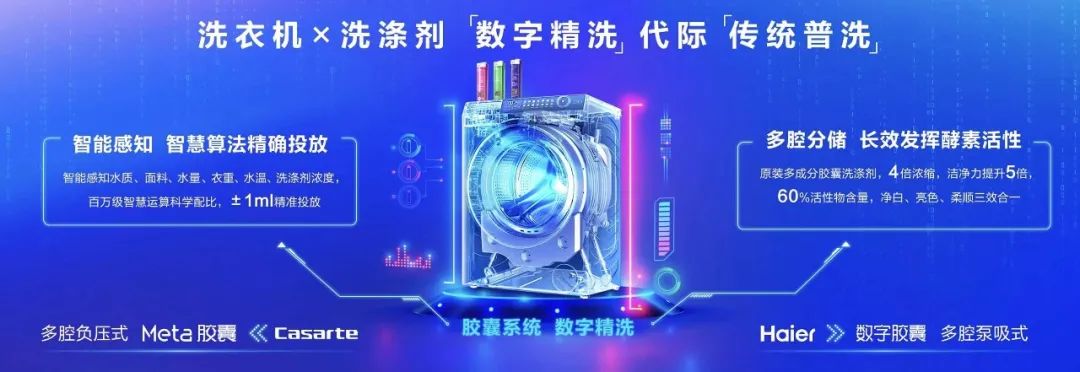 在此基础上,海尔全新推出的胶囊洗衣机,通过机身三腔分储,避免普通洗衣液活性低的问题。洗衣机内搭载数字胶囊系统,智慧算法能智能感知水质、面料、衣重、水量、水温、浓度,配合AI大数据运算,提供最佳配给量,做到洗涤剂的智慧配给、精准投放。海尔添彩胶囊洗衣机以场景生态新模式,一键就能满足洗净、护色、柔顺3种需求。使得洗护衣物告别了传统普通洗涤,进入了数字精洗时代。