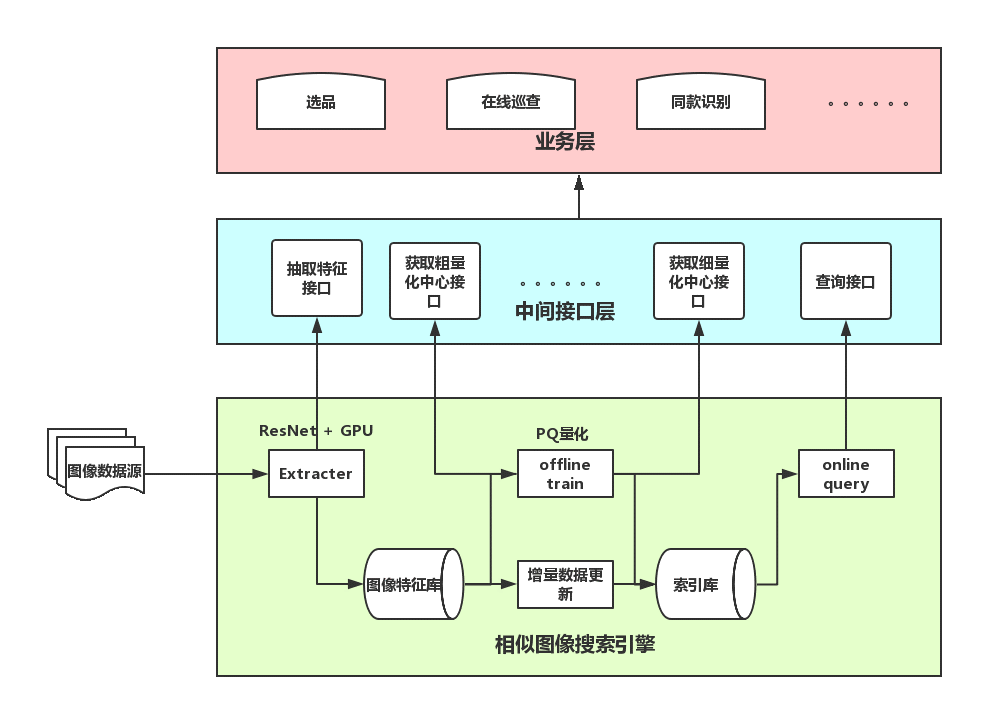 图像检索系统的整体架构如图 2 所示。基于底层的图像搜索算法,通过中间接口层提供给具体的业务使用,提升了相似图像搜索的扩展性,能够快速地响应实际的需求和应用。