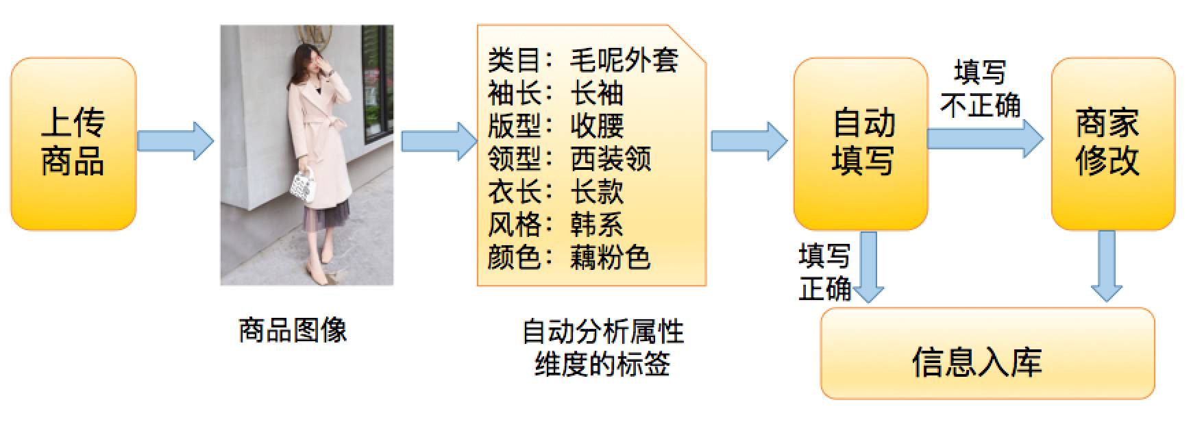 商家在发布新品时,需要填写商品的标题、上传图片,填写商品的属性值,以及详情页信息。当上新量很多的时候,特别是筹备双 11 期间,填写商品信息比较费时,加大了商家的工作量。而图像算法能够在商家上新的环节,通过分析上传的图片,得到图中的关键信息,为商家提供便利。